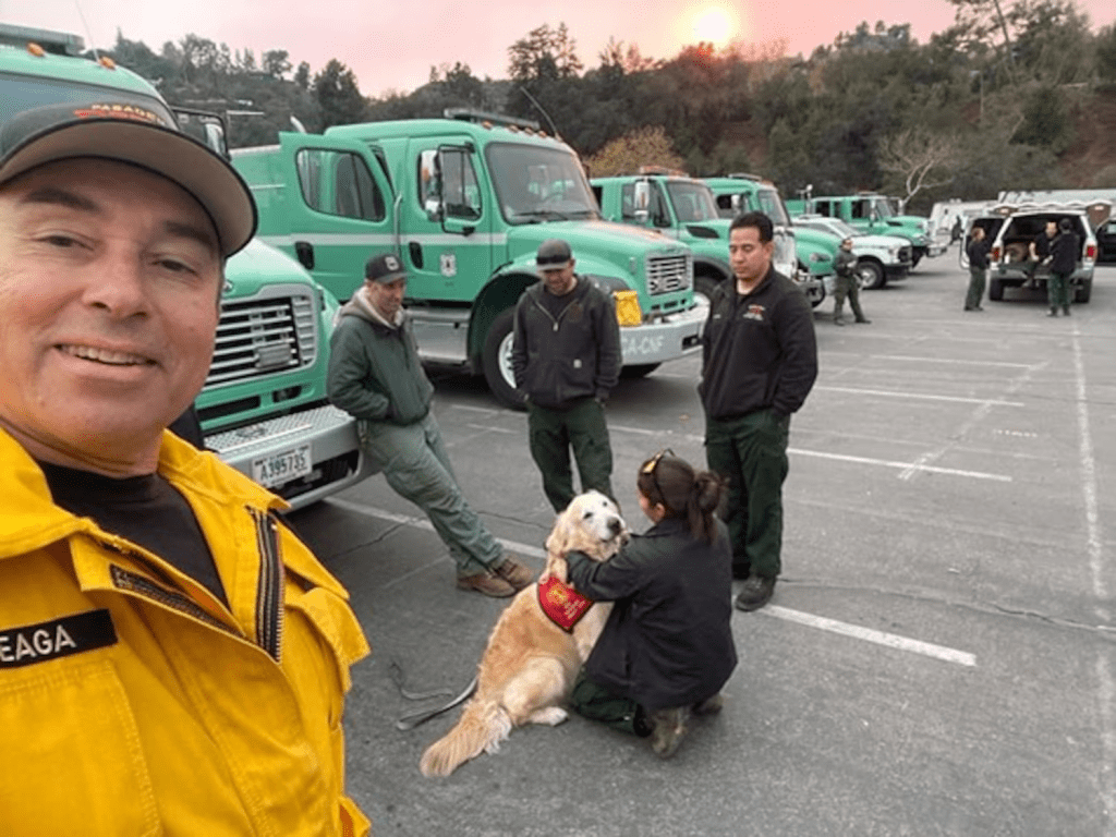 A volunteer chaplain for the Pasadena Fire Department, Laveaga takes Jack to greet firefighters returning to base camp, as well as displaced families at evacuation centers. Their presence provides a much-needed emotional outlet for those who have faced extreme challenges and losses.