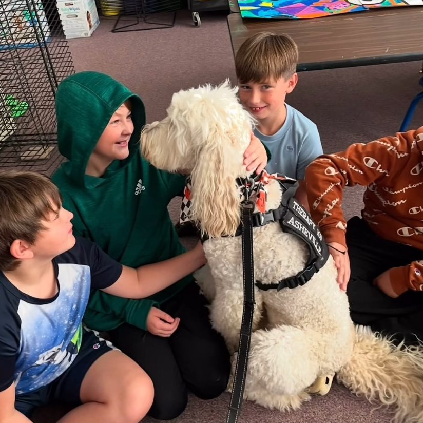 But it’s not all serious work for Kora. She regularly “paw-trols” downtown Asheville in her custom cart, complete with blue lights, and participates in school and community programs, brightening lives with her vibrant personality and colorful outfits.